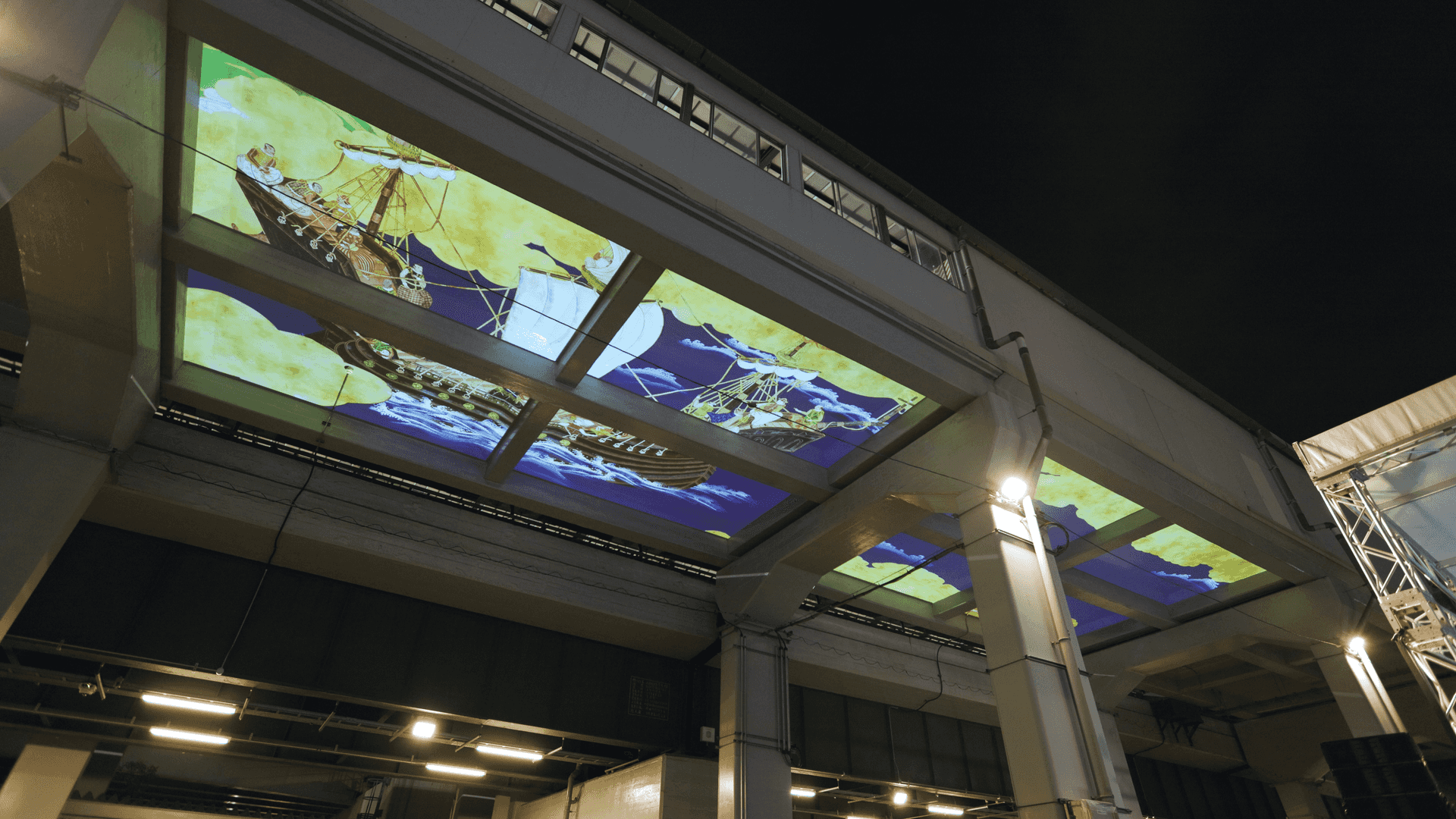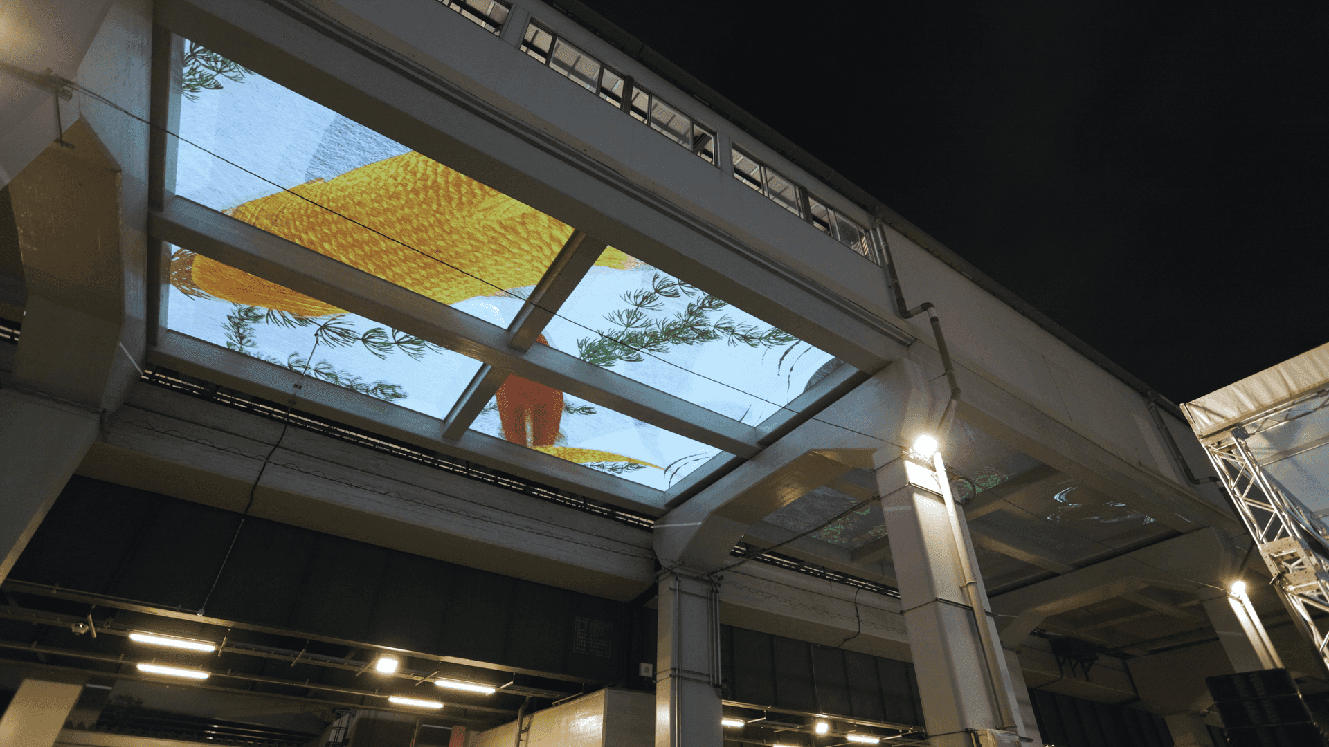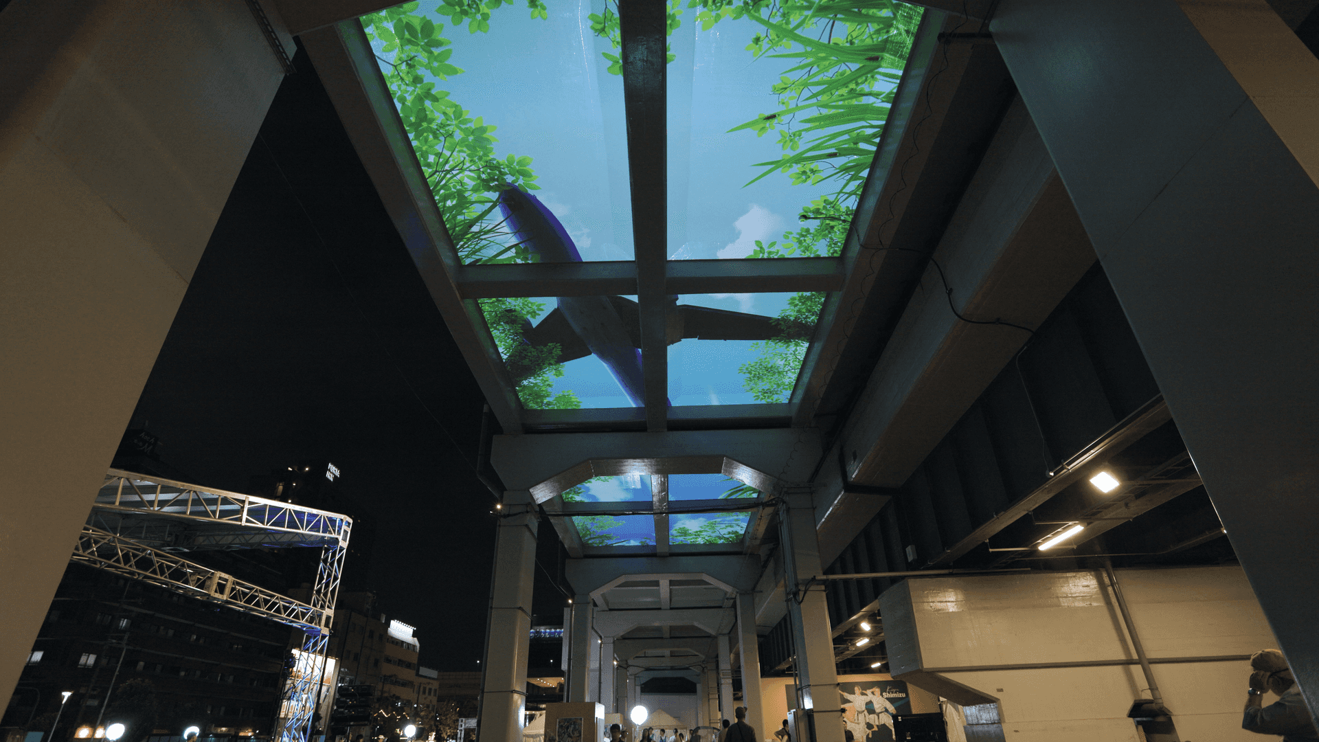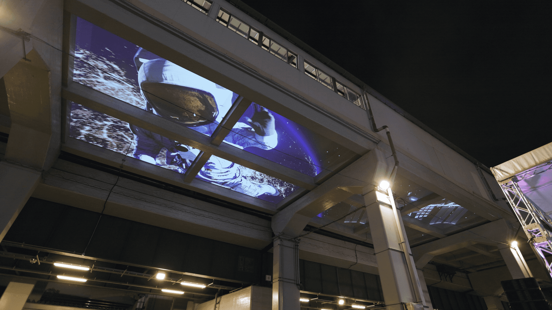 JR西日本弁天町駅にある「べんてんひろば」にて“あつまる、つながる”をコンセプトに夜空や宇宙、アートなど高架下を⾒上げることで世界が広がるような展開をプロジェクションマッピングを⽤いて空間演出を設計·制作