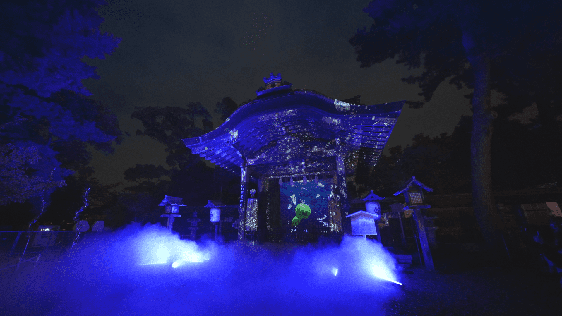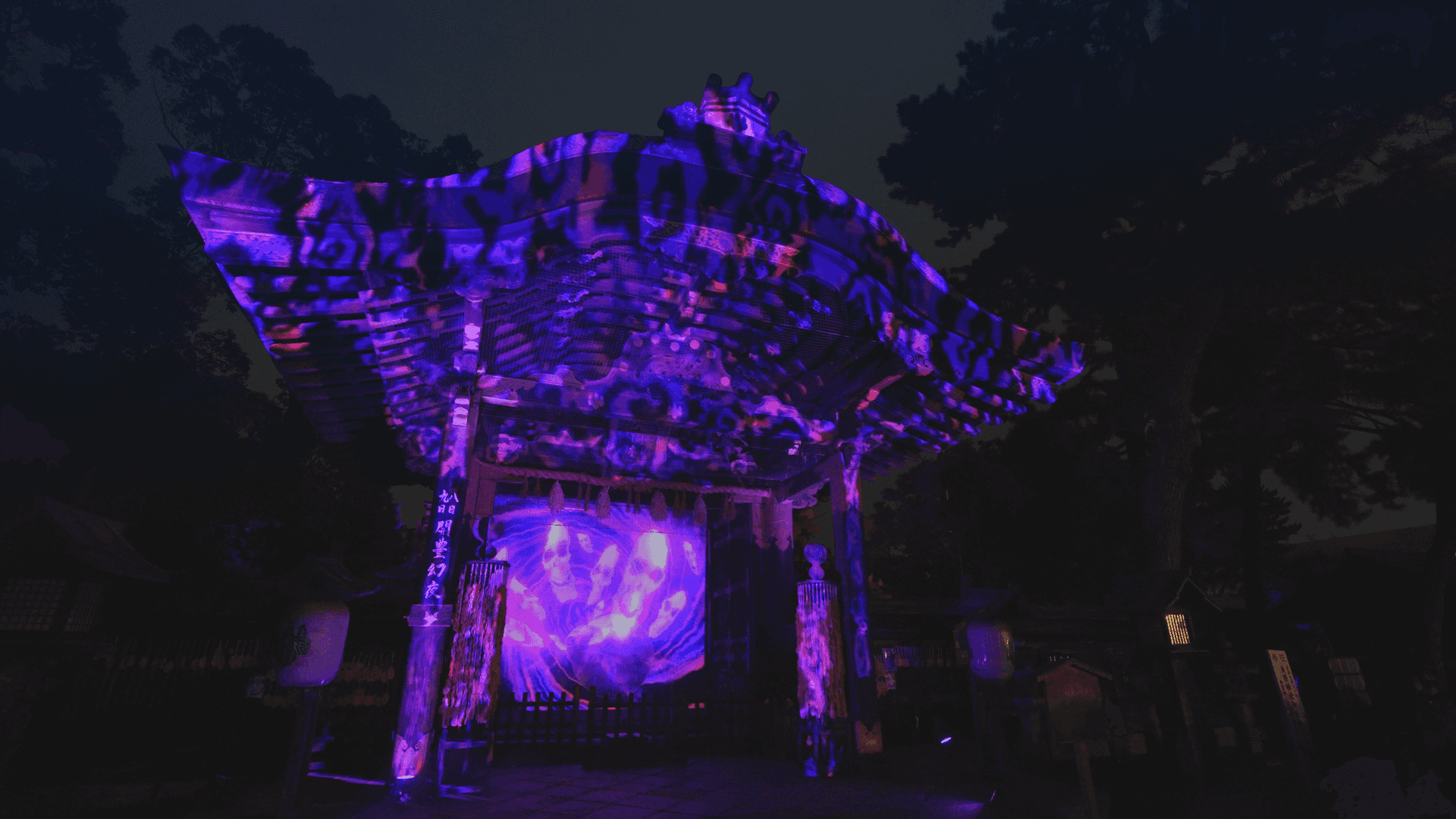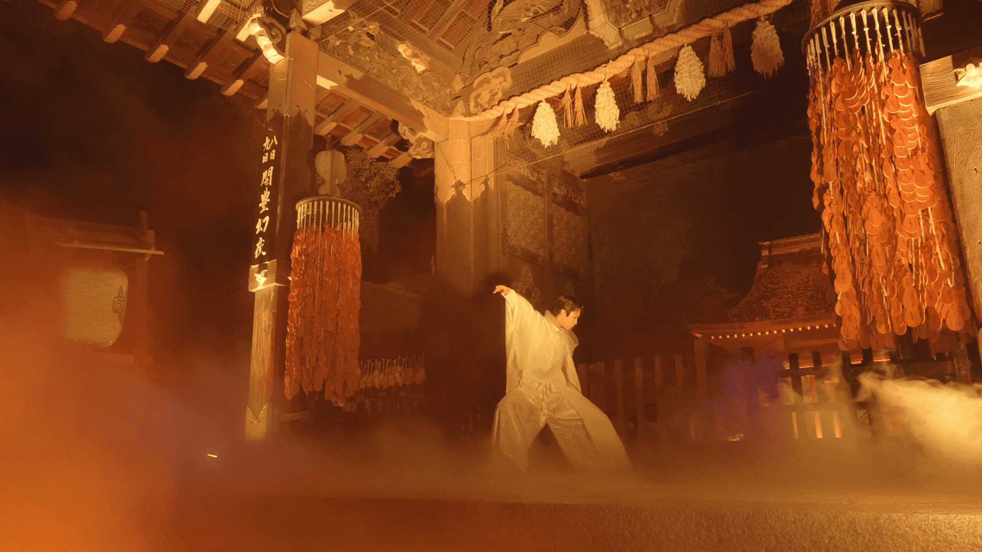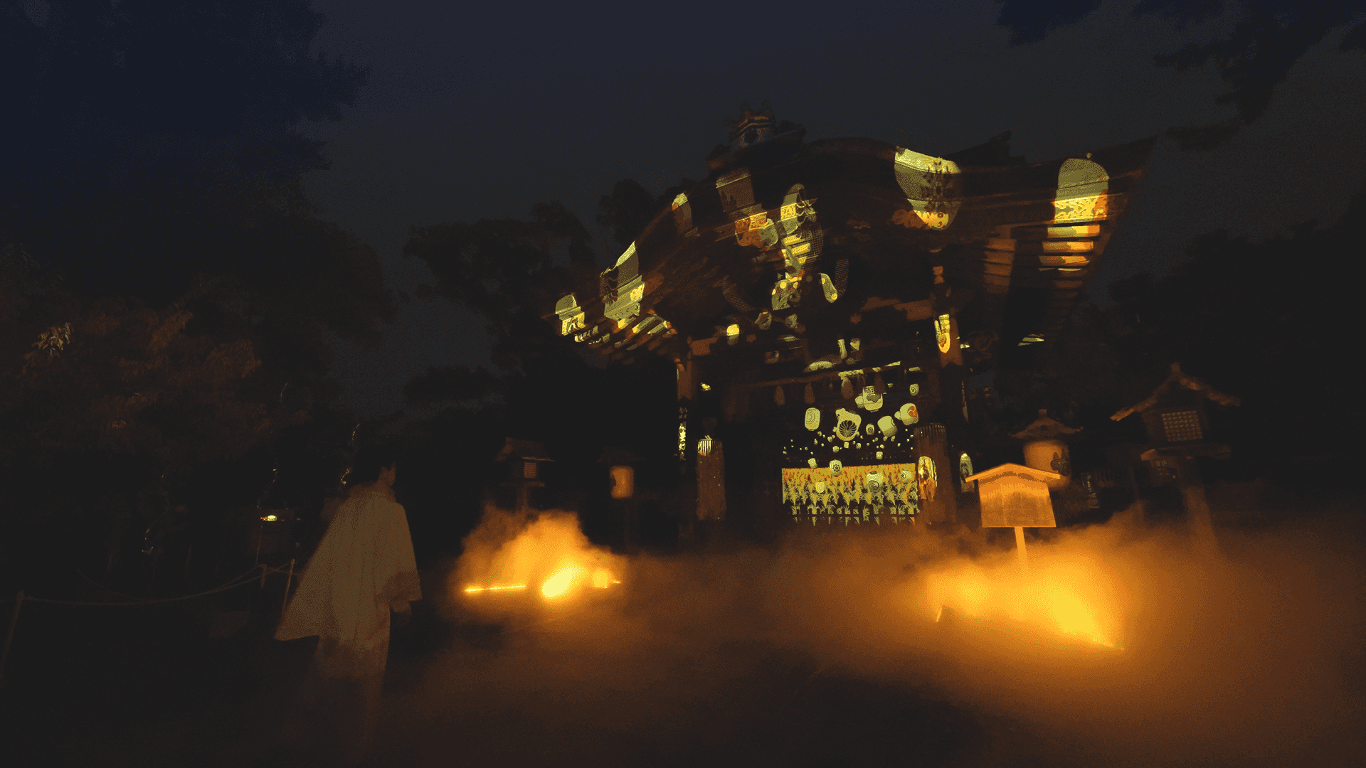 桃山の美を宿す国宝・唐門を“門出“の象徴として解釈し、「開豊」をテーマにした寓話を構築。千成瓢箪を中心に、人々に訪れる厄災や鎮まり、そして豊穣の未来を映し出す物語。唐門を過去と現在を接続する門として捉え、霧・光・音が重なり合う中、豊かさが開かれる未来への希望を表現しました。